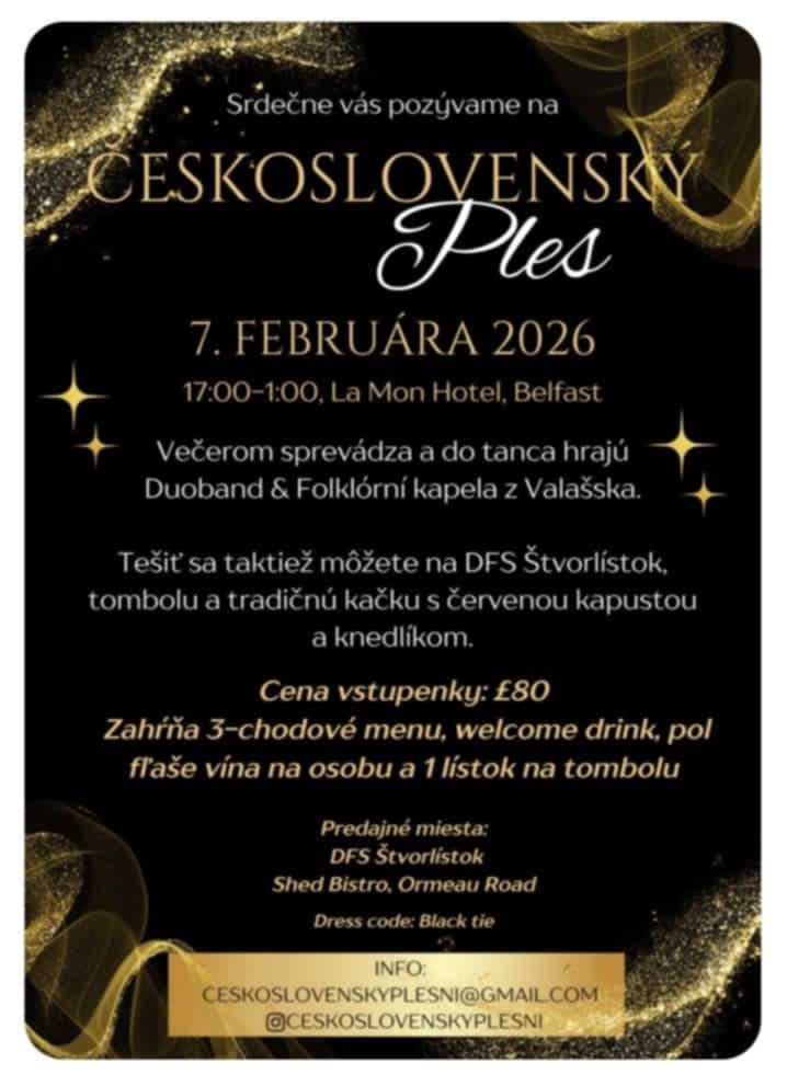 Přijďte prožít první Československý ples v Belfastu – večer, kde se propojí elegance, hudba a radost z toho, že i v cizině držíme spolu!