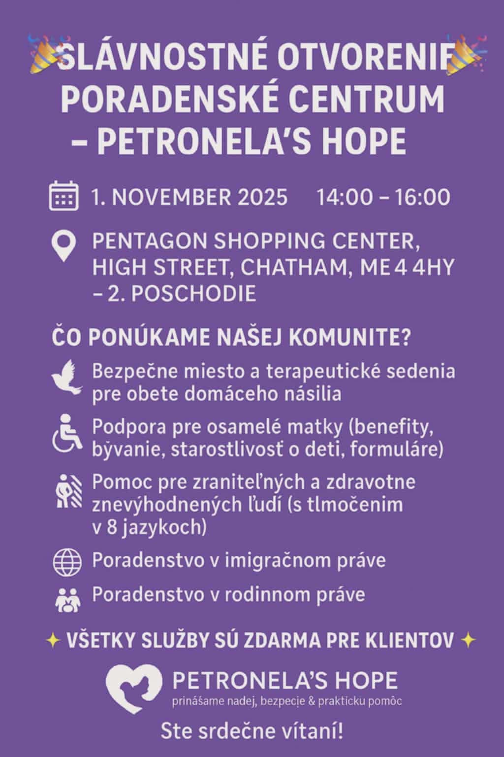 S radosťou vás pozývame na slávnostné otvorenie nového Poradenského centra Petronela’s Hope, ktoré sa uskutoční 1. novembra 2025 od 14:00 do 16:00 v Pentagon Shopping Centre v Chathame (2. poschodie).